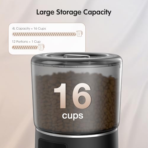 • 4L Large Capacity: UPOTGP automatic cat feeder can storage 16 cups of dry cat food. 12 portions=1 cup of dry food. For example, if your cats need 1/2 cup of food daily, you could set up 6 portions a day. This varies with different kibble sizes.