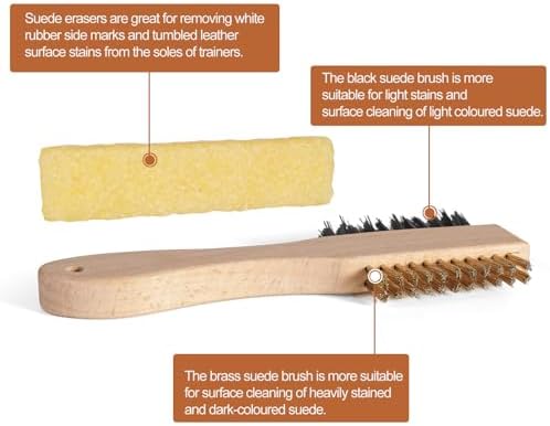 - 3. EFFECTIVE COMBINATIONS: The black suede brush is more suitable for cleaning lightly stained and light-colored suede surfaces. The brass chamois brush is better suited to cleaning heavily stained and dark-colored suede surfaces. The suede eraser for shoes is more resistant to long term use without wear and tear.
