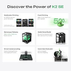 - The Creality 3D printer K2 SE delivers a powerful combination of multicolor capability, speed, and precision, making it an excellent choice for hobbyists, educators, designers, and small studios. Designed for advanced multicolor and multi-material printing, the K2 SE 3D printer supports up to 16-color output when paired with four CFS units, each holding four spools—perfect for figurines, cosplay props, detailed art pieces, and vibrant multi-color projects. Its 220 × 215 × 245 mm build volume provides ample room for prototypes, functional parts, props, and creative prints while maintaining a compact, space-saving footprint ideal for any desktop setup. The printer pairs seamlessly with Hyper-PLA and other high-speed filaments, delivering stable performance even during fast printing. Setup is quick and easy: simply attach the touchscreen and spool holder, then follow the guided auto-calibration steps. Features like partial-failure skipping and Creality Cloud integration enhance workflow convenience for both beginners and seasoned makers. The Creality K2 SE is equipped with an advanced direct-drive extruder featuring a quick-swap nozzle, filament run-out sensor, and an automatic magnetic cutter for clean and reliable transitions, ensuring smooth, uninterrupted printing in both single-color and multicolor modes. Its rigid die-cast aerospace-grade aluminum alloy frame, reinforced with gussets and crossbeams, significantly reduces vibrations for cleaner edges and sharper layers. Intelligent calibration features—such as auto leveling that probes only the active print area and input shaping to minimize ringing—ensure consistently high-quality results. With a maximum speed of 500 mm/s and a workflow designed for efficiency, the K2 SE 3D printer is perfect for rapid prototypes, daily printing needs, classroom projects, and creative color-rich designs, making it a versatile, professional-grade tool for anyone ready to elevate their 3D printer setup.