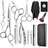 - 💇〖Convenient Hair Cutting Tools〗This professional haircutting kit includes salon scissors, a stainless straight edge razor for precise shaving, small facial hair scissors for nose, eyebrow, and beard trimming. It also features a barber cap to keep clean during haircuts, a hair blending cutting razor for smooth thinning, and a neck duster brush to remove hair from your skin. Professional hair scissors with useful hair salon accessories would offer you a nice hair cut experience.