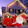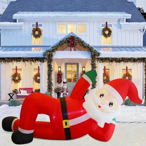 - Christmas Inflatable Decorations: Our Xmas inflatable lighted Giant Lying Santa Claus is 12 feet long and 6.25 feet tall when inflated. It adds an eye-catching centerpiece to your holiday seasonal layout and makes it big and attractive Christmas decorations around. The Christmas Santa come internally lit, bathing your outdoor space in a soft, welcoming glow when evening falls, enhancing its festive appeal