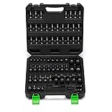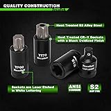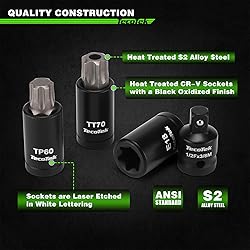 ✅【Size Include】14PCS E-Torx Sockets: 1/4"Dr.: E4, E5, E6, E7, E8; 3/8"Dr.: E10, E11, E12, E14, E16; 1/2"Dr.: E18, E20, E22, E24; 17PCS Torx Bit Sockets: 1/4"Dr.: T6, T7, T8, T9, T10, T15, T20, T25, T27, T30; 3/8"Dr.: T40, T45, T47, T50, T55; 1/2"Dr.: T60, T70; 17PCS Tamper Proof Torx Bit Sockets: 1/4"Dr.: TT6, TT7, TT8, TT9, TT10, TT15, TT20, TT25, TT27, TT30; 3/8"Dr.: TT40, TT45, TT47, TT50, TT55; 1/2"Dr.: TT60, TT70; 12PCS Torx Plus Bit Sockets: 1/4"Dr.: TP8, TP10, TP15, TP20, TP25, TP27, TP30; 3/8"Dr.: TP40, TP45, TP50, TP55; 1/2"Dr.: TP60; 7PCS Socket Adatpers: 1/4"F to 3/8"M, 3/8"F to 1/4"M, 3/8"F to 1/2"M, 1/2"F to 3/8"M Adapters, 1/4"Dr, 3/8"Dr, 1/2"Dr. Impact Drill Adapters ✅【Premium CR-V】Made with durable S2 steel and sockets have CR-V Steel material with blackened manganese phosphate finish that offer exceptional strength and resistance to wear, longevity and a reliable performance over time. ✅【Precise Engineering】Precisely and automatically machined bit tips to ensure accurate size, allen wrench socket set chamfered bit ends insert smoothly into fasteners and protect both bits and fasteners from damaged edges. ✅【High Visibility Markings】The storage case has printed size and all drive tools have size markings on sockets for easy identification. Convenient for getting suitable size accessories, saving time and effort. ✅【Versatile Applications】All TecoTek Tools meet or exceed ANSI performance standards. It comes with 1 year quality guarantee. Abundant variety of sizes make repairs easy on any car, bike or motorcycle, and perform industrial work for machinery.