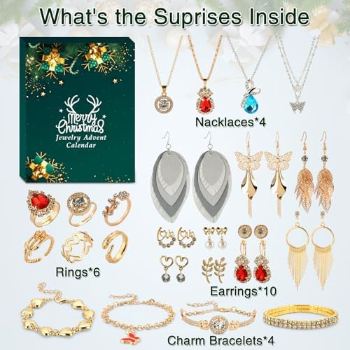 - Jewelry Advent Calendar: The countdown calendar has raised your expectations for Christmas. Each set includes ten earrings, six rings, four necklaces, and four bracelets, totaling twenty four different pieces of jewelry, enhancing your jewelry collection
