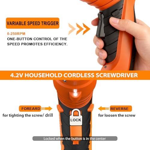 - POWERFUL MOTOR & 5.5 N.M TORQUE: Small Cordless Screwdriver is equipped with higher performance 4.2V pure copper motor, delivers is up to 5.5 N.m/ 50 in-lbs torque for a wide range of drilling and fastening daily applications