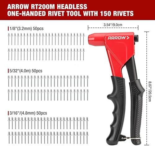 Arrow 3-in-1 Rivet Gun, One-Handed Headless Pop Rivet Gun Kit with 150Pcs Rivets, Professional Manual Heavy Duty Rivet Gun Kit Without Head Change, for Metal, Wood and Plastic