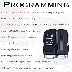 - Note: This is Aftermarket Remote Key Fob/Non-OEM, and It Doesn’t Come with LOGO or Badge. Important Note: It only Supports Regular Key Vehicles. It Doesn’t Support Push Start Button Vehicles. WILL NOT WORK FOR VEHICLES WITH PASSIVE ENTRY (also called PEPS, push button ignition, smart key or proximity system) Compatible with Dodge Models: Ram 2500 2019 2020 2021 2022 2023 2024 Ram 3500 2019 2020 2021 2022 2023 2024 Ram 4500 2019 2020 2021 2022 2023 2024 Ram 5500 2019 2020 2021 2022 2023 2024 Replacement for: FCC ID: GQ4-76T Part Numbers: 68374994AC 68374994AA 68374994AB Frequency: 433 MHz Battery: CR2032 Button configuration: lock, unlock, tailgate, remote start, panic PROGRAMMING: Self-Programming is not available. And it requires qualified locksmiths or dealership to program it.