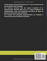 - Ce livre propose une série d'exercices en C++ qui se concentre sur la nature orientée objet du langage. Les exercices couvrent tous les aspects essentiels de la Programmation Orientée Objet avec C++, comme l'héritage et le polymorphisme, main aussi présentent les fichiers, les bases de données et l'interaction avec l'utilisateur. Ces concepts sont présentés progressivement aux étudiants à travers des exercices de difficulté croissante.