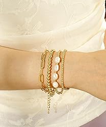 Stackable Bracelets: A womens gold bracelets set contains 4 pcs bracelet gold, 1 piece Link bracelet ,1pieces beaded bracelets, 1 piece Crystal bracelet and 1pearl bead designs Adjustable Size: Different style bracelets can provide you more choices for varied clothing matching. The length of these link chain bracelets are ADJUSTABLE; ChainChain bracelet is 6.8" + 1.35" extender chain, Other 3 bead bracelet is elastic, approx 6.8" , Stretchable, suitable for most womens wrist wear Non Tarnish Gold Bracelet: Gold paperclip bracelet is made of stainless steel 14 k gold plating. Natural stone, Cultured freshwater pearls, crystal beads, gold plated Czech seed beads. We make our bracelets lead-free, nickel-free to protect your health Stack Bracelets Gift: The appearance of stacking bracelets is super pretty, are perfect gifts for mothers, aunts, girlfriends, sisters, and friends on birthdays, anniversaries, Valentine's Day, Mother's Day, weddings, Thanksgiving, and Christmas Customer Satisfaction: Badu is an enterprise that pursues product quality and customer satisfaction. If you have any problems there, please reach out to us via amazon "contact seller", we’ll get you taken care of with 24 hours ASAP