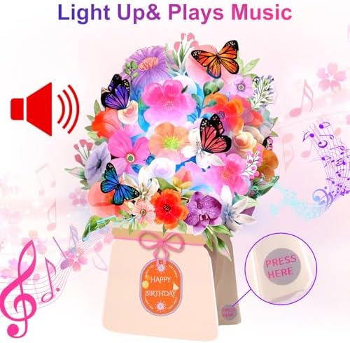 Birthday Cards, Light and Music Happy Birthday Card, Lily and Butterflies, 10 Inch Life Sized Forever Flower Bouquet 3D Pop Up Birthday Gift Card for Women Wife Mom Daughter Sister