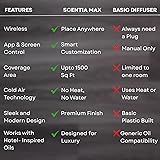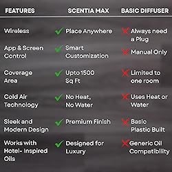 Wireless, Rechargeable & Waterless Technology: Enjoy a clean and consistent fragrance experience using advanced cold-air diffusion. The Scentia Max is completely wireless and rechargeable, eliminating the need for cords. Safe for homes with kids and pets, it uses no heat or water, preserving the integrity of your essential oils while providing long-lasting scent. Smart Control with Scentia App & Touch Screen: Customize your aromatherapy experience effortlessly with the Scentia App or the intuitive touch screen controls. Adjust scent intensity, set schedules, and manage operational hours (1, 4, or 8-hour cycles) directly from your phone or through the user-friendly interface. No remote needed — control it your way. Adjustable Scent Intensity for Large Space: Designed to cover areas up to 1,500 sq. ft., the Scentia Max offers five adjustable scent levels. Whether you prefer a subtle hint of fragrance at Level 1 or a bold aromatic presence at Level 5, you can easily tailor the ambiance to suit your mood and space. Premium USA-Made Fragrance Oils: Scentia Oils are proudly crafted in the USA and specially formulated for cold-air diffusion.Safe for both pets and children, these oils provide a luxurious and worry-free experience.Your purchase includes a complimentary 50ml fragrance oil sample, allowing you to start enjoying your diffuser Complete Package with Quality Assurance: The Scentia Max comes with everything you need to elevate your space — empty 120ml oil bottle, 50ml complimentary fragrance oil sample, a plug adapter, and a user-friendly instruction manual. Enjoy peace of mind with a 3-month warranty and access to dedicated customer service support via email, chat.