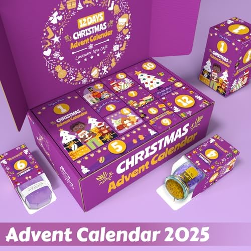 Advent Calendar 2025-12 Days of Christmas Advent Calendar for Women, Mom, Wife, Girlfriend, Sister, Her - Unique Lavender Spa Gifts Basket Set Includes Coffee Mugs, Scented Candle, Bath Salt, Soap