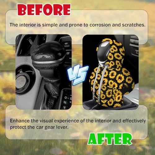 - Beautiful Sunflower Design: This gear shift hoodie cover features a vibrant sunflower pattern that adds warmth and a natural feel to your car's interior. Shift knob hoodie ideal for owners who love sunshine and nature, suitable for both men and women