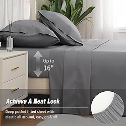 【100% Cotton Sheets】You can always believe the comfort that pure cotton brings you. This king size sheets set is made of 100% natural cotton, 400 thread count sateen weave, creating a super soft and luxurious sleeping experience for you. The manufacturer and material are all Oeko-tex Standard 100 certified, ensuring a restful sleep. 【Silky Soft & Breathability】Comfortable cotton sheets set can improve your sleep quality. Our california king sheets are distinctively cooling, lightweight, and breathable. Cotton material will get softer with each wash. Allow the sheets a couple of washes, you'll experience the exceptional softness and silky texture of our sheet set. 【Perfect Fit, Easy Fit】Designed with a 16-inch deep pocket and elastic all around, our king sheets deep pocket can fit tightly on your deep mattress all night. 2 envelope pillowcases perfectly cover the pillows and are easy to put on. Achieve a neat look easily with the deep pocket king sheet set. 【Durability & Easy Care】Simply machine wash in cold water on a gentle cycle with like colors. Tumble dry low, and remove promptly after the cycle to avoid wrinkles. Low temperature ironing if necessary. Won't pill, fade, or shrink with multiple washes, our cotton bed sheets are durable for long-lasting use. 【4-Piece King Size Sheets Set】This grey king sheet set includes 2 pillowcases (20*40"), 1 flat sheet (108*102"), and 1 fitted sheet (78*80"+16"). Suitable for any room in your house, including bedroom, kid's room, guest room, dorm, or vacation home. Moreover, it's a perfect choice for holiday gifts.