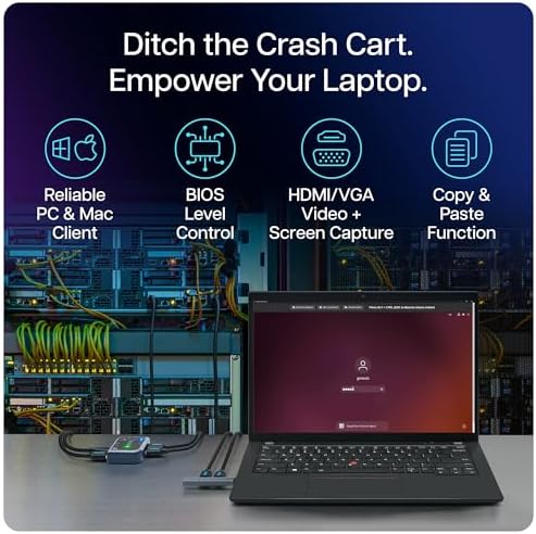 - NO CONFIG HASSLES. Easily connect the portable crash cart and control any server from your laptop without installing drivers or software on the target server: works for MacOS (Sonoma and beyond) and Windows (Windows 10 and beyond)