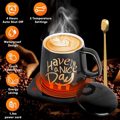 - 🎁【Regalos Perfectos para Mujeres】: Este juego de caja de regalo de taza de café cuidadosamente seleccionado puede ser un regalo, perfecto para cualquier ocasión como cumpleaños, días festivos especiales, Día de Acción de Gracias y Navidad, San Valentín, etc. Este innovador calentador de tazas de café combina características elegantes y prácticas para mantener calientes las bebidas; y la placa calentadora de café puede usarse como calentador de velas para llenar tu habitación de fragancia y dormir tranquilamente; perfecto para amantes del café, chicas, chicos, familia, parejas, amigos o colegas.