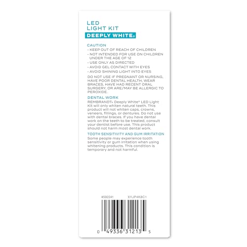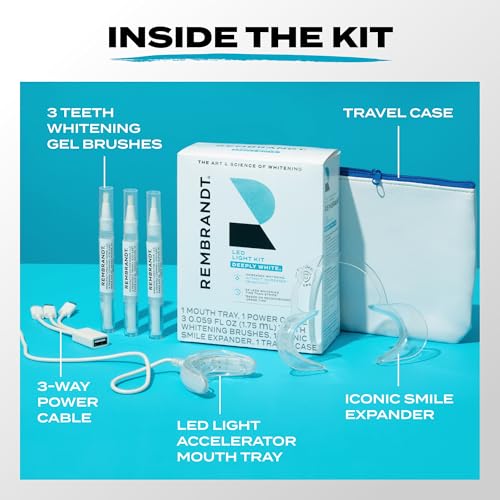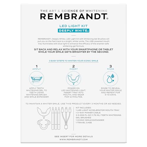 - Includes: 1 Rembrandt Teeth Whitening Kit, Deeply White, includes 1 LED light accelerator mouth tray, 1 3-way power cable, 3 0.059 fl oz teeth whitening gel brushes, 1 iconic Wear LED light accelerator mouth tray, 1 travel case
