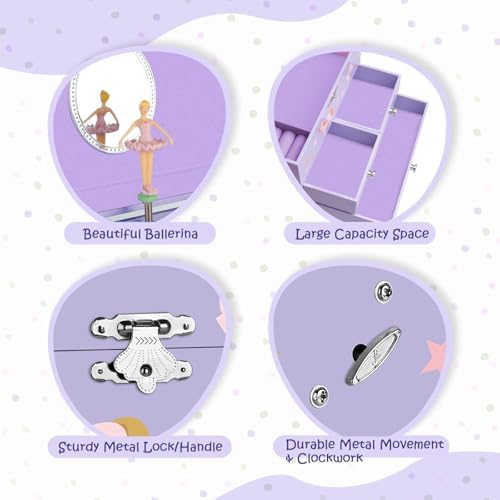 Musical Jewelry Box for Girls with 3 Drawers, Unicorn Toys for Girls Age 3-8 with Spinning Ballerina & Unicorn Jewelry Set, Girl Music Boxes Birthday Christmas Gift Purple