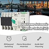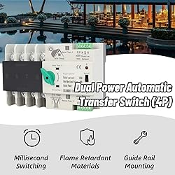 - AUTOMATIC AND MANUALfor : This power automatic transfer switch can be operated automatically or manually , allowing for seamless and millisecond switching without interruption . COMPACT AND for : With a compact structure and , this switch provides dependable performance and easy installation and maintenance , ensuring a long lifespan . CONTINUOUS POWER SUPPLY for : When the primary power source experiences an abnormality , the backup power source immediately takes over , ensuring continuous , , and power supply . FINE CONSTRUCTION for : The switch is made of premium PC flame retardant plastic material and features silver alloy contacts that provide excellent insulation , high temperature , anti aging properties , and safety . Specification for : Material for : PC Flame Retardant , Silver Alloy Switch Type for : Secondary Distribution Rated Current for : 63A Rated Frequency for : 50Hz 60Hz Electrical Level for : PC Class Isolation Type Control Circuit for : Auxiliary Circuit for : Two Relays , Each Relay with Two Sets of Contacts Capacity for : AC110V50HZ le=5y Touch Time for : Switching Time for : Return Time for : Closing Time for : packing list for : 1 x ATS 1 x Manual Notice for : 1 . The maximum ambient temperature is not more than 40? , the minimum is not less than ?5? , the average temperature within 24 hours is not higher than 35? . 2 . The installation site should not be higher than 2000m . 3 . When the maximum temperature reaches 40? , the relative humidity of the installation site should not exceed 50%; When the temperature is ?5 ? , the relative humidity is high . For example , when the temperature is 25 ? , the relative humidity is 90% .