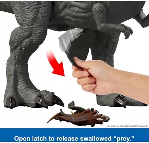 This Super Colossal Tyrannosaurus rex dinosaur figure brings the excitement of Jurassic World Rebirth home with its huge size and distinctive look. At 39 inches long, with movable joints and content-accurate design, this T. rex action figure is ready for battle moves and poses. It can also "swallow" mini dinos for realistic movie re-enactments! Just unlatch the stomach to "release" the dinos. Makes a great gift for big dinosaur fans ages 4 years and up. Colors and decorations may vary.