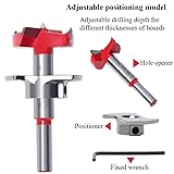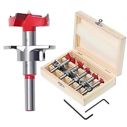 【Depth Stopper Design】Our flat wing Forstner drill bits are designed with a depth stopper, which can be fixed on the shank and keeps you from drilling too deep, with limited depth from 15mm to 40mm. You can also remove the stopper for unlimited depth if you need it. 【Superior Cemented Carbide】 This hinge drill bit set is made of high-quality cemented carbide, and the blade is characterized by high accuracy, smooth cutting operation, good resistance to shock and good toughness. It is an easy chip removal for a longer life and has excellent boring ability and performance. The Hinge Drill Bits Includes: 15mm(19/32"), 20mm(25/32"), 25mm(1"), 30mm(1-3/16"), 35mm(1-3/8") 【Double-edged Design & Self-Centering】 The drill bit tip adopts an arc curve double-edged design to remove waste and ensure your work efficiency quickly. The centre spur of each bit guarantees accurate drilling and prevents walking and shaking during operation. Use the centre spike to create perfect circles and precise holes. 【Wide Application】 Suitable for drill press, pistol drill, bench drill, vertical drilling machine, hand-held electric drill, stand motor-driven drilling machine and mobile ribbon-type magnetism drilling machine. Use for mounting spherical door shoot tip, drawer; perforation on wood, plastic, and plywood. 【Easy to Use】 Easily and conveniently dip a smooth hole in the wardrobe door or desk by yourself with the hinge drilling jig, suitable for your home operation, even if you are not a professional, you can quickly locate drill centre points for hinges and mounting plates.
