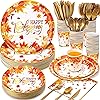 350 Pcs Thanksgiving Fall Party Supplies Maple Leaf Dinnerware Set Disposable Plates Napkins Paper Cups Plastic Cutlery for Autumn Thanksgiving Harvest Party Decor Serves 50(Pumpkin)