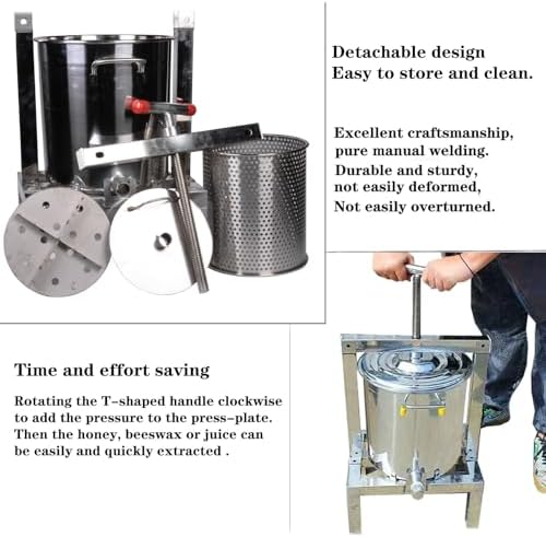 - Honey Press Beeswax Machine: Separation and filtration of beeswax,honey, juice and vegetable, wine residue, olive seed oil. Equipped with detachable stainless steel filter and valve: controllable flow rate, practical, high-speed, and excellent filter effect.