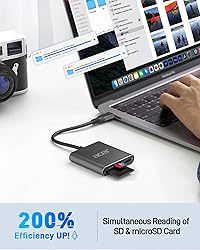 SD 4.0 Data Transfer: The Acer USB-C SD Card Reader supports the latest UHS-II memory cards, delivering blazing speeds of up to 312MB/s. Enjoy data transfers three times faster than ordinary UHS-I card readers, perfect for 4K movies, high-resolution photos, and video Vlogs. Read & Write 2 Cards Simultaneously: Say goodbye to cumbersome file transfers. This Micro SD Card Reader allows you to read and write data on two cards simultaneously, enabling seamless sync, transfer, and copying between your cards without the hassle of constant plugging and unplugging.(📌Note:If the case is too tight, the adapter may not insert properly) Versatile Compatibility: The SD Card Reader comes with a USH-II SD slot and a USH-II micro SD slot, both equipped with SD4.0 protocols. Effortlessly read a wide variety of memory cards, including UHS-II SD, SDHC, SDXC, MicroSD, MicroSDHC, MicroSDXC, MMC, and RS-MMC, allowing seamless access to your entire memory card library. 100W PD Fast Charging: The Type-C SD card reader supports the PD fast charging protocol with a maximum power of 100W. The port is for charging only and does not support data transfer. Durable & Portable: Crafted with a sturdy aluminum alloy case and a 0.66ft cable, this Micro SD Card Reader combines portability with durability. Wide Compatibility: The SD 4.0 Memory Card Reader is compatible with a wide range of devices, including laptops, tablets, iPhone 16/16 Pro/15/15 Pro, MacBook Air/Pro, iPad, and Android smartphones. Plug in the card reader and your memory cards to easily share your moments. (📌Note: Android phones require OTG support).