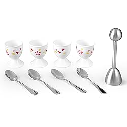 Exquisite Supplies: Every morning, there are exquisite hard-boiled eggs on the dining table, family and children are around the table to enjoy a rich breakfast.At the same time kiwi fruit and candies can also be placed in our beautiful cups No more complicated egg cutting! Easy to operate, our vibration-activated eggshell remover with a ball grip will ensure a smooth cut every time and no eggshells in your meal Deluxe Egg Cup Set: The multifunctional set includes 4 ceramic egg holders, 4 stainless steel spoons and an egg topper remover. This set is your perfect companion for breakfast or any meal When placing eggs, it will be very stable no matter where it is placed on the desktop.The product adopts a wide-mouth simple design, the surface is smooth, and it is easy to clean food residues Appropriate Ceramic Material: This product uses ceramic material, which will not emit harmful substances when cooking; and the heat conduction is fast and uniform, not easy to damage, and will not crack