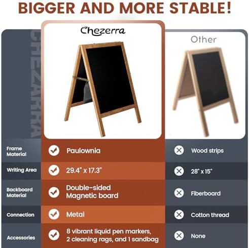 - A-Frame Double-sided Magnetic Chalkboard: Experience the high-quality anti-ghosting matte surface that makes writing and cleaning effortless. Our wooden sandwich chalk board boasts a generous writing area of 29.4" x 17.3" , providing ample space for your creativity to flourish. You can directly post pictures and convey romantic messages on it