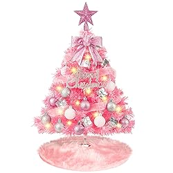 - Characteristics:High quality material:Our desktop mini Christmas tree is made of durable, weather resistant materials that are long-lasting. Realistic appearance, suitable for most desktop decorations, welcome the arrival of ChristmasEasy to install:Open the packaging, organize it, simply stretch the branches and ensure they are evenly distributed, then hang up Christmas decorations and lights, and put on a mini tree skirt. The sturdy tripod ensures stability, so you can easily enjoy holiday decorationsMulti functional decoration: It can not only decorate the desktop, but also decorate the fireplace, dining table, and any place you want to decorate, creating a different atmosphere for this special festivalIn addition to adding scenery to the desktop, our mini Christmas tree can also be used as decoration for gatherings and events. Whether you're hosting a holiday party or just wanting to add some extra atmosphere to your home, this is a great way to create a festive atmosphere for Christmas celebrations, and can also be given as a gift to family and friendsSpecifications:Material: PVCColor: PinkSize: 24 inchesThe packaging includes:A 24 inch desktop Christmas tree with a Merry Christmas logo, 16 Christmas ball accessories (4 sparkling pink, 4 sparkling silver, 4 white), 1 pink ribbon, 1 bow, 6 gift boxes, 1 pink tree top star, 1 pink tree skirt, and LED lightsAttention:The mini Christmas tree is packaged in a box and needs to be manually organized. DIY Mini Christmas TreeDue to different screen displays, colors may vary slightlyThere are quite a few accessories, please pay attention to safety during installation. Wishing you a Merry Christmas