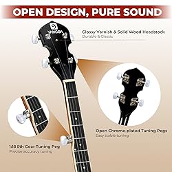 Why Choose Nylon String Banjo? - Nylon strings offer a warm, mellow tone and are gentle on fingers, eliminating string buzz. They’re more durable, rustproof, and low-maintenance than steel strings, with stable tuning for consistent sound quality. Perfect for beginners and pros alike, our banjo kit even includes two extra string sets (nylon + steel strings) for meet your suits. Whether you’re starting out or exploring new sounds, this banjo is your ideal musical companion. Premium 5-String Banjo Kit -- Designed for lasting quality and exceptional sound, this updated nylon string banjo features a detachable sapele resonator back and polished rim for rich acoustic resonance, paired with a smooth C-shaped okoume neck and polished copper frets for effortless playability. Perfect for players who value both comfort and premium craftsmanship. Professional-Grade Remo Drum Head -- This banjo features an 11-inch Remo frosted drumhead paired with an adjustable 24-hook chrome-plated tension hoop, delivering exceptional tuning stability and rich, clear tones. The frosted surface enhances projection and tonal clarity, making it ideal for both practice and live performances. BANJOS with RESONATOR : The detachable resonator allows you to easily switch between resonator back and open-back banjo styles, making this banjo perfect for a variety of musical genres. Whether you're playing bluegrass with the resonator for enhanced projection or enjoying folk, old-time or classical music in open-back mode, this flexibility caters to your unique playing style and performance needs. ADULT BEGINNER BANJO KIT: This five string banjo kit features a durable gig bag, a piezo pickup for enhanced sound, and a wall holder for easy access. TWO EXTRA BANJO STRING SETS(steel + nylon) for tonal versatility, TWO FINGER PICK SETS(celluloid + metal) to suit your style. Adjust wrenches, E-tuner, bridge, shoulder strap, cleaning cloth, accessory storage bag, effective string-length ruler, and a user manual. Ensure you can playing unbox with a simple setup. Just buy with confidence.