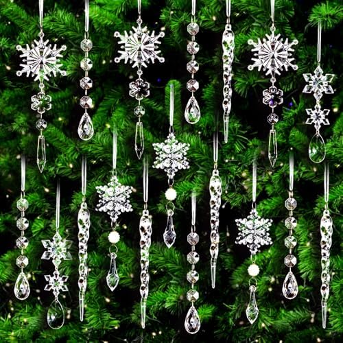 18pcs Crystal Christmas Tree Ornaments, Hanging Acrylic Snowflake Icicle Ornaments with Drop Pendants for Winter Holiday Decorations