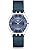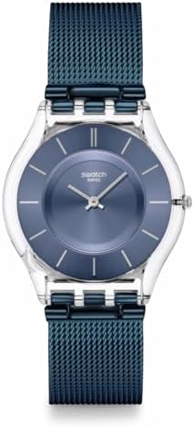 Featuring on this ultra-slim watch is a sun-brushed blue dial with silver-colored indexes, hour and minute hands in a shiny transparent biosourced case with biosourced glass. An adjustable stainless steel mesh bracelet with blue PVD coating completes the look of this sleek timepiece.