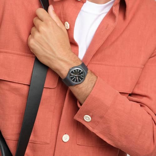 The transparent dark gray dial of this timepiece gives a view of the movement and features light blue indexes and a beige minute track. Burgundy hour and minute hands with glow-in-the-dark effect and a light blue seconds hand point to the time under the biosourced glass. A matte dark gray biosourced case with matching biosourced strap, loop, and buckle complete the watch.
