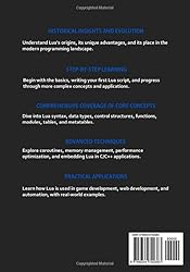 - Lua Programming Language. This comprehensive guide offers a clear and thorough learning to one of the most versatile and lightweight programming languages.Key FeaturesHistorical Insights and Evolution: Understand Lua's origins, its unique advantages, and its place in the modern programming landscape.Step-by-Step Learning: Begin with the basics, writing your first Lua script, and progress through more complex concepts and applications.Comprehensive Coverage of Core Concepts: Dive into Lua syntax, data types, control structures, functions, modules, tables, and metatables.Advanced Techniques: Explore coroutines, memory management, performance optimization, and embedding Lua in C/C++ applications.Practical Applications: Learn how Lua is used in game development, web development, and automation, with real-world examples.Hands-On Examples and Exercises: Each chapter includes practical examples and exercises to reinforce learning and application.Future Trends and Community: Stay updated with current developments and future prospects in the Lua programming community.What You Will LearnIntroduction to Lua: Grasp the history, features, and installation of Lua across various platforms.Getting Started with Lua: Write your first Lua script and understand basic data types and variables.Control Structures: Master conditional statements, loops, and iterators.Functions and Modules: Define functions, handle arguments and return values, and organize code with modules.Tables and Metatables: Manipulate tables and implement object-oriented programming using metatables.Error Handling and Debugging: Employ effective error handling techniques and debugging tools.Standard Libraries: Utilize Lua’s standard libraries for string manipulation, table functions, math operations, and file I/O.Advanced Topics: Delve into coroutines, garbage collection, and performance optimization.Embedding and Extending Lua: Embed Lua in C/C++ applications and extend Lua using the Lua C API.Practical Applications: Apply Lua in game development, configuration, automation, and web development.Lua Ecosystem and Tools: Discover popular Lua libraries, frameworks, development environments, and debugging tools.Case Studies and Examples: Learn from detailed case studies, best practices, and expert tips.Future of Lua: Explore the latest trends and future prospects in the Lua programming world.Whether you're a novice eager to learn programming or an experienced developer looking to add Lua to your skillset, this guide provides everything you need to master Lua and leverage its power in your projects. Start your Lua programming journey today.