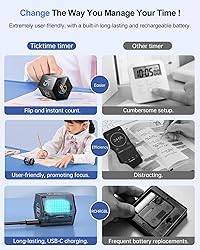 Super easy to use. Ticktime pomodoro timer clock offers a hassle-free experience with its 6 preset countdown times (5/15/25/30/45/60minutes) activated by a simple flip. Plus, if you need a custom countdown, it's a breeze to set with just two buttons. Revolutionize your time management and ensure every minute is productive. Enjoy the convenience of dual timing modes with our desk timer. Not only can you choose from the 6 preset countdown options or set a custom countdown, but you can also switch to count-up mode by flipping the timer bottom up and stop it by standing the screen up. The timer covers a wide time range from 00:01 to 99:59, ensuring it suits all your timing needs. Setting up the timer is a breeze for maximum comfort. This ADHD timer is incredibly versatile and ideal for a wide range of situations, including the office, work, meetings, tasks, studying, reading, workouts, cooking, and countless other scenarios. In fact, you can use this timer in virtually any situation you can think of ! Experience ultimate convenience with our work timer. Pause the countdown by flipping it to the front screen, and resume it with another flip. Customize the sound to your preferred volume level, and select from either a mute option or an adjustable sound alert. Enjoy more choices for added convenience. Small, magnetic, and rechargeable. Our gravity timer measures a compact 1.9×1.8×1.7 inches, fitting comfortably in your hand and weighing only 2.2 ounces. It's highly portable, easily slipping into pockets or bags. The timer comes with a magnetic base, perfect for attaching to the fridge or any steel surface, allowing you to track time without using your hands. It's rechargeable too, featuring a durable lithium battery and a USB-C charging port, saving you from the expense of buying batteries. Important charging & usage guidelines: This cube timer should not be used while charging, and it is not waterproof. For initial use, please charge it for 12 hours, and for subsequent uses, charge it for 4 hours. Once the charging is complete, unplug the charging cable and simply press any button to activate the timer.
