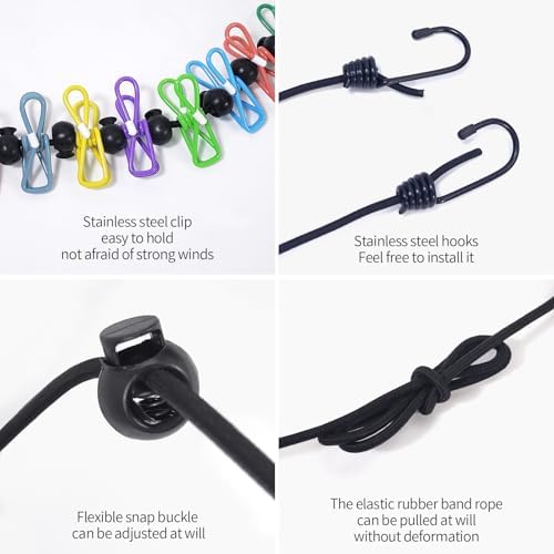 - DURABLE & LONG-LASTING: Constructed with high-quality latex and nylon rope, paired with rust-resistant metal hooks and clips coated with protective film. Capable of holding heavy-duty clothing like jeans and jackets, ensuring durability and longevity.