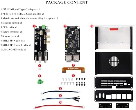 - This is Version Pi5 Module BOX-B , Includes Aluminum Alloy Case, PCIe To 4-CH USB3.2 Gen1 Adapter Board, Pi5 Micro HDMI To HDMI and Type-C Adapter Board and 10 items in total.