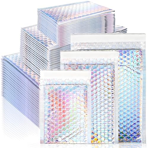 50 Pieces Metallic Bubble Mailers, Self-Seal Poly Padded Envelopes, Waterproof Holographic Bubble Shipping Envelopes for Mailing, Packing, Small Business