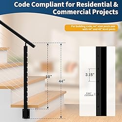 Side Mount Space Saving: This side mount stair post is specially designed for installation against left-sided staircases. The 44" post comes pre-drilled with 11 pairs of stair holes and is ideal for railing projects measuring 36-38 inches. It serves as both structural end and middle posts in stair sections, which maximizes space utilization, creating a visually wider and more comfortable environment. Versatile & Stylish Security: The 4.5"x5.5" welded plate of the side mount post offers a larger contact area. Designed with 4 holes and a 6mm thickness, it enhanced stability and durability. Our side-mount cable post seamlessly combines style and safety, making it perfect for deck projects, including fixed decks, porches, and even commercial railings or stairs. Code Compliance: This structural square post is designed with 3.15" cable spacing to meet code requirements for cable railing systems. Generally, the span between two posts should not exceed 4 feet to pass the 4" sphere test. Reviewing local cable railing codes before purchasing is advisable, as requirements may vary by state. Premium Material: Our black powder-coated side mount post is made from SS304 for high hardness and impact resistance, preventing deformation. The black rubber grommets provide durable support at any stair angle. Note: T304 is not recommended for projects within 10 miles of saltwater or seaside environments. Related Items: Depending on the project situation, you may need cable railing accessories to build a complete framework. We offer black handrails, wire ropes, terminals, angled washers, etc. Please visit our store for more information.