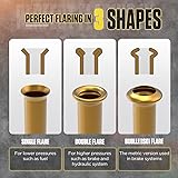 【Professional Tools To Save Your Time】 - The Brake Line Flare Tool Kit makes short work of making tubing into a standard 45 degree single flare, bubble flare or double flare. Great for making perfect flares on brake lines, transmission cooler lines and fuel lines. Easy and quick operation will save you time and money when creating brake lines on your project. 【Wide Application】 - The brake flaring tool can be used with 3/16", 1/4", 5/16", 3/8" and 4.75mm diameter various tubes. Brake flaring tool applicable for soft metal tubes, including copper and aluminum, works with 304 stainless steel, steel tubing. making it a must-have brake flaring tool for the DIY or mechanic. 【Durable, Stable And Accurate Flaring Tool】 - The brake line flaring tool are made of high-quality steel, heat-treated and oxidized for extreme hardness, durability and resistance to damage. Meanwhile, through professional design and rigorous testing, our brake line flaring tool are extremely accurate and stable, and can produce three types of perfect 45-degree flares in a short period of time, which is a professional brake line and fuel line flaring tool! 【Use Your Vise】 - Use on a bench-mounted vise in your workshop or on a hitch-mounted vise in the field (not intended for use under car); 6-inch (15.2 cm) T-handle screw clamp holds die and tube in place so you can create flares quickly and easily Tips for Use: Before doing a flare, deburr the inside and outside of the tubing to ensure that metal shavings and impurities are removed from the inside and outside of the tubing. Then, apply a small amount of anti-seize to the end of the cut tubing to prevent problems when squeezing. Also, it can be added a little oil to the flaring cones (OP.1 and OP.2). Finally, it is a matter of taking care to put the appropriate fittings on the ends of the tubing, with the flared ends facing outward.