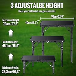 𝟑-𝐀𝐃𝐉𝐔𝐒𝐓𝐀𝐁𝐋𝐄 𝐇𝐄𝐈𝐆𝐇𝐓𝐒: The heights of folding table can be adjusted from 10.3 inches/26.2cm, 18.9 inches/48.1cm, 27.5 inches/70cm. You can sit on the lawn when picnic with the lowest hight. Or you can siting beside the table with chair when adjusted to the highest hight 𝐋𝐈𝐆𝐇𝐓𝐖𝐄𝐈𝐆𝐇𝐓 & 𝐏𝐎𝐑𝐓𝐀𝐁𝐋𝐄: The folding table weights 4.92lbs(2.25kg) and folds up into 15.7"x12.2"x2.55"(40x31x6.5cm). The compact and lightweight design is perfect for home use when working, sturdy and outdoor use in camping, trip, sports events, etc 𝐑𝐄𝐋𝐈𝐀𝐁𝐋𝐄 𝐀𝐍𝐃 𝐒𝐓𝐔𝐑𝐃𝐘: Crafted from thicker aluminum alloy and MDF, this picnic table features deformation-resistant stability and durability, providing a solid surface for various activities. It has a maximum weight capacity of 66 lbs to ensure your safety 𝐄𝐀𝐒𝐘 𝐓𝐎 𝐀𝐒𝐒𝐄𝐌𝐁𝐋𝐄: Installation of the folding table takes only a few minutes, no tools required. With its quick-folding design and convenient carry handle, taking it everywhere you want 𝐖𝐈𝐃𝐄 𝐑𝐀𝐍𝐆𝐄 𝐎𝐅 𝐔𝐒𝐄: Beyond serving as a picnic table, this portable table is suitable for outdoor and indoor scene including beach outings, fishing trips, bedrooms, living rooms, and even in mini vans or trucks