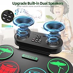 【9 Sensitive-Touch Pads for Better Sound】 The electronic drum set features 9 pads including 2 CRASHES, 3 TOMS, 1 SNARE, 1 BASS, 1RIDE and 1 HI-HAT, making it easier to play all sorts of music styles. 7 Tones and 6 rhythms deliver better sound effects while 10 demos are beneficial to music learning, perfect for professional and beginner. 【Drumming On The Way】Our kids drum set is powered by built-in 1200mAh rechargeable battery, lasting up to 10 hours play per charge. It is easy to store, doesnt take very much space so that you can roll it up, pack it in your bag to take it anywhere for outdoor parties, choir practice, studio, music/drum lessons. Practice drum set supports record and play demo songs. 【 Endless Creativity and Games Fun with MIDI】This drum set includes MIDI compatibility, making it easy to connect with drum software, music apps, and games like DTXMania for practice! It is great pro adult drum set needing MIDI features. 【BUILT-IN Dual Stereo Speakers】Sound from practice drum pad is emitted from attached high-quality dual speaker system with astonishing bass effect. Volume of the drum set can be adjusted to different levels, and the upgraded foot pedals can bring you a more realistic drumming experience. 【Enjoy Your Music Privately】 EKEMOND drum set features with 3.5mm headphone jack, your kids can practice drum by wearing a headphone (not included) without disturbing the household. A wonderful festival surprise for music lovers who are interested in playing the drum. 【Best Surprise For Your Kids】The 9-pad electric drum pad caters to the musical interests of children of ages 3+, you can send this electric drum set for your kids, families, and friends as present - for Birthdays or Christmas. The One-year protection makes your purchase without worry