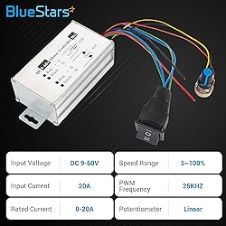 - SPECIFICATION Input Voltage: DC 9-60V Output Voltage: Linearity under load Input Current: 20A Rated Current: 0-20A Speed Range: 5~100% Speed Type: Regulating Current PWM Frequency: 25KHZ Potentiometer: Linear Wiring type: Terminal Dimension: 92x52x36 mm Weight: 155g. WIDE APPLICATION The Adjustable Voltage Range is truly smooth and adjustable from 9V to 60V. It is suitable for DC Motors Within 20A. ENHANCE MOTOR PERFORMANCE Our products are perfect for controlling the speed of DC brush motors, allowing you to fine-tune performance for optimal precision in any application. The motor speed controller fixes the following symptoms: 1. Inconsistent Speed 2. Overheating 3. Unresponsive Controls DURABLE AND LONG-LASTING BlueStars’s motor speed controller is kept safe inside a strong aluminum box that's built to last and protect it from harm. Plus, there are holes in the box's sides and top that help it stay cool, making sure it works well. EASY TO INSTALL Installing the motor speed controller is very simple with 4 steps: 1. Before you attempt to wire the controller, make sure your power is off. And please turn off the switch on the speed controller. 2. Follow the wiring diagram on the controller, and connect the wires between the power supply, controller, and motor accurately. Please distinguish the positive and negative terminals for the power supply. Attention: Do NOT reverse positive and negative power loads; it will damage the controller 3. Fix the motor in place. Then turn on the power and controller switch. Now adjust the potentiometer knob to control motor speed. The LED display will show you the real-time speed percentage. 4. If everything goes well, fix the controller in place somewhere. Enjoy your use experience.