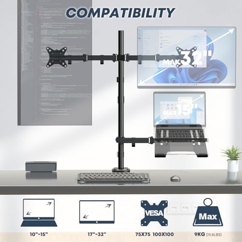 Dual Monitor Stand and Laptop Mount Fit Two 17 to 32 Inch Monitor and 10 to 17 Inch Laptop,Extra Tall Adjustable Stand,19.8 lbs Weight Capacity per Arm,Black