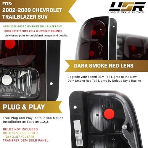 - ✔️ 《 DARK SMOKE RED LENS TAIL LAMPS 》 Time to update your old, faded or even damaged stock Lights with These SMOKED RED Lens Rear Tail Lights Set of 2 Pieces. Perfect 02-09 Trail Blazer SUV Accessories to Upgrade and a great gift Idea or Replacement Part. Compatible with 2002-2009 Chevy Trailblazer / 2002-2006 Chevrolet Trailblazer EXT SUV All Models