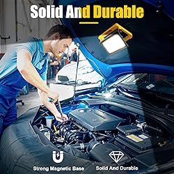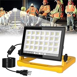 【Portable LED Work Light with Stand】The led work light flood light is feature 112 high efficiency units LED Beads, brightness of 4500 lumens, with 13ft cord with plug. It also has a hidden hook, tripod hole, the portable work light can be apply to tripod stand(Package are NOT Included Tripod Stand) 【Fold-Flat Design & 180° Rotating Head & Magnetic Base】Portable and easy carry to job sites and workshops with fold-flat design. Features 180° light head rotation for a variety of positions as needed. Besides, this work light has a strong magnetic base, which makes this led work light can be attached to the metal surface stably 【3 Lighting Modes & Memory Function】The led work light with memory function and with 3 lighting modes: High, Medium, Low, allowing you to choose the brightness of the light according to your needs. The memory function is activated by turning the light off and on again after 8 seconds, or the next time it is used 【Waterproof and Durable】IP66 waterproof rating,the portable work light made of sturdy ABS material to protect from all kinds of extreme weather, widely used in work shop, car repair, construction site, garage, interior renovation, etc. 【Multi-Application】The led flood light with plug is ideal for workshop, construction site, garage, lathe, car maintenance, factories, interior renovation, etc.