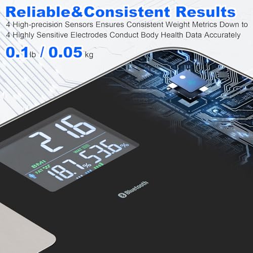 - Precision at 0.1lb: This advanced body fat scale is equipped with 4 highly sensitive electrodes and 4 ultra-precise G-shape sensors, which have undergone rigorous testing for 100,000 cycles to ensure superior accuracy. The scale guarantees measurements precise to 0.1lb/0.05kg and supports a maximum weight capacity of 400lb/180kg.