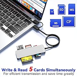 2-in-1 Port USB C+USB A - 6 in 1 multi sd card reader with USB C + USB A. Dual port design is compatible with most devices and systems on the market. It is widely compatible for iPhone 15 series, Macbook, Google, Samsung and other brands of smartphones, tablets, laptops, cameras, camcorders, etc. with USB C ports, and even traditional USB A computer devices. In addition, the 50 cm long cable provides enough space to connect different devices without any obstacles. Simultaneous Reading of Five Cards - Our multi memory card reader allows users to insert five different memory cards (CF, XD, TF, SD, MS, M2 etc.) at one time, and all five cards can be read at the same time. This integrated design not only saves users' device space, but also greatly simplifies the operation process and greatly facilitates the process of transferring and managing data between different devices. There is no need to repeatedly insert and remove memory cards, which is very efficient and convenient. 5Gbps High Speed Transfer + 2TB Large Memory - The memory stick pro duo reader usb c has a transfer speed of up to 5Ggbps, which means that no matter how big a file you need to transfer, it can be done in a short time without a long wait, for example, a 1GB video file can be easily done in about 20 seconds. In addition, memory stick reader has the ability to transfer data in both directions stably. Whether from the memory card to the computer, or reverse operation, can ensure the integrity and security of the data. The large 2TB read/write memory also makes storage a non-issue. Plug and Play - The xd card adapter is plug and play, no additional drivers are required and no APP driver is needed. Simply plug the cf card adapter usb c into your device and start transferring data with ease. Say goodbye to complicated setup process and enjoy hassle-free file access to transfer photos, videos and file information with ease. Bi-directional data transfer is stable and fast with no delay and no interference. Good User Experience Design - The multi card adapter is made of heat-resistant aluminum alloy casting and tin-plated pure copper core, which has good heat dissipation performance and ensures that the device still maintains stable performance under long-time high load working condition. In addition, the built-in reinforced cable design improves the tensile strength and bending resistance of the cable. The small size, ultra-light weight and compact design make it easy to carry.