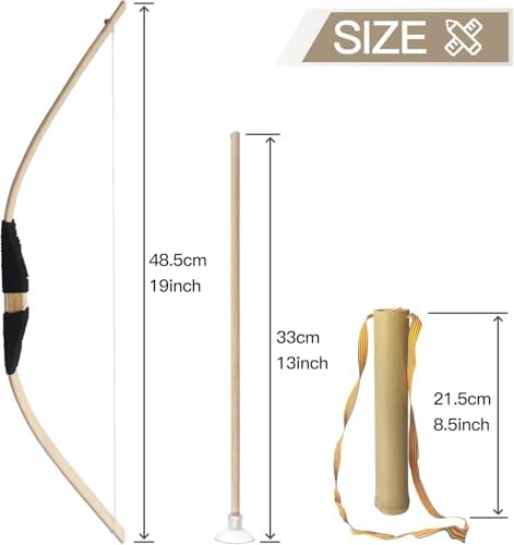 - 【Bow and Arrow Set】— Made from solid wood and lasting bamboo, the bow itself measures approx 19 inches long, the wood arrows measure approx 13 inches long.
